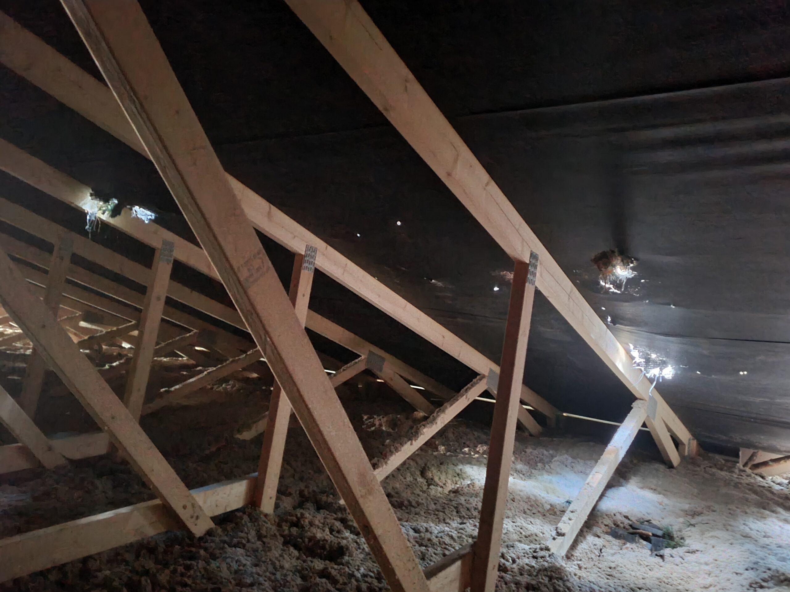Kartsin, et probleemiks saab vihmaga kahjustada saanud villa välja vahetamine. Tegelikkuses oli vill seal, mille kohal katuse aluskangas suured augud olid, täitsa kuiv. Korjasin villa seest ära katkised katusekivi tükid ja männiprahi ning lappisin katuse aluskanga ka seestpoolt teibiga ära. Vähemalt need kohad, kuhu ma ulatusin. Päris katuse servaalune on juba sisuliselt villa sees ja seal olevate aukude parandus jäi ainult pealtpidiseks. Seestpool kasutasin Tesa aurutõkke teipi.