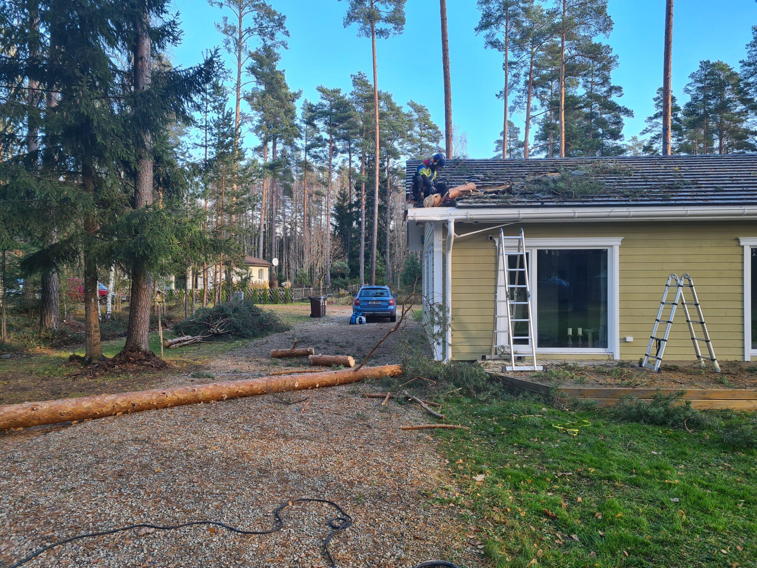 Pealelõunaks oli puu majalt eemaldatud. Arboristiga jäi jutt, et järgmisel nädalal tuleb ta tagasi ja viib ära ka kõik oksad ja palgijupid. Loomulikult lisatasu eest.