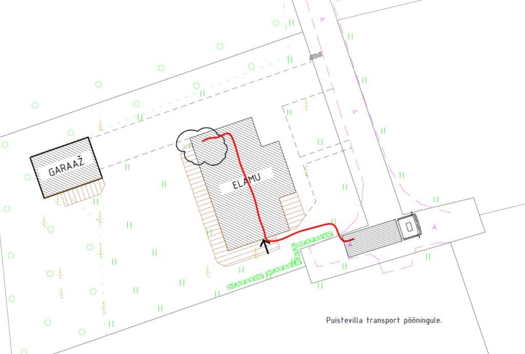 Minu mõõtmiste põhjal peab villa transportiv toru olema vähemalt 37 m pikk (punane joon), et ulatuda viidatud auto asukohast pööningu tagumisse nurka.