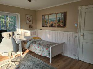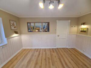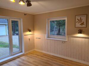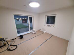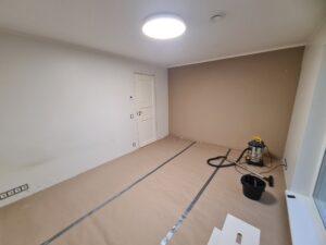 Järgmisena nokkisin esmalt kõik seinte, lagede aja aknapalede lahtised ja mõrased värvi- ja pahtlikohad lahti. Lisaks täitsin tüüblite augud puidust mööblipunnidega. Kõik loetletud kohad pahteldasin ja lihvisin mitmeid kordi.
