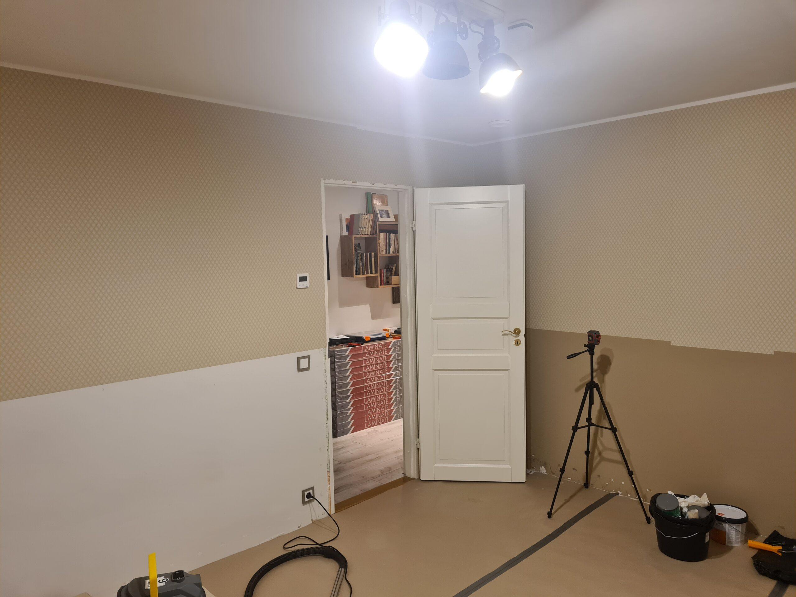 Remont algas 21.12.2024, mil sai demonteeritud kõik pildid ja riiulid seintelt ning põranda- ja ukseliistud. Õnneks kogu maja peale olid liistud eelnevalt paigaldatud vaid minu toas. Sest esiteks olid kõik nurgad ilmselt käsisaega saetud, sest liitekohtades olid vahed sees. Teiseks olid liiste püütud liimida, aga reeglina oli põrandaliist liimunud vaid paarist kohast ja kohati kukkusid need seinast peaaegu ise ära.